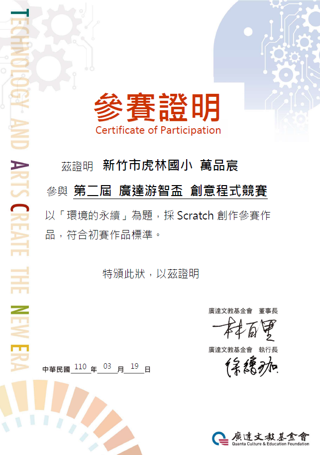 恭喜本校6年愛班萬品宸、周佳鋐同學參加第二屆廣達游智盃創意程式競賽,以環境永續為題,採用SCRATCH設計「海龜吃什麼」...