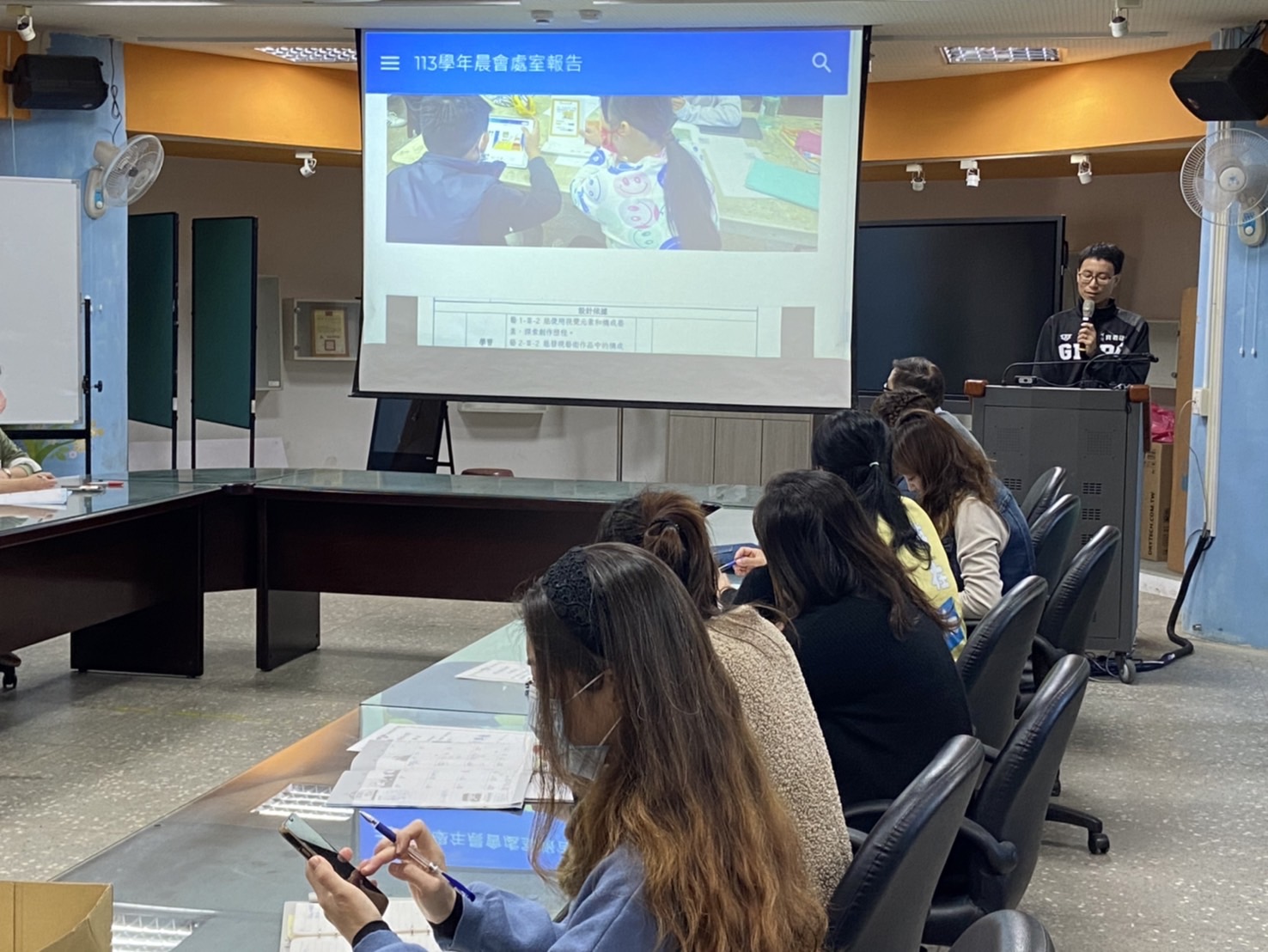 高峰校園日誌:至帆老師在今日教師晨會上向夥伴們分享日前到大湖國小觀課的心得,資訊科技與合作共創、資訊科技與溝通表達是這一...