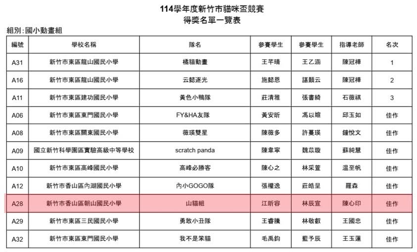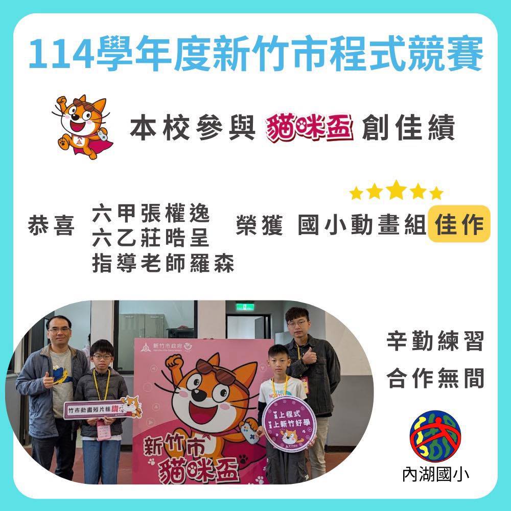 <p>本校參與 <strong>114學年度新竹市「貓咪盃」競賽</strong> 表現亮眼,榮獲 <strong>動畫...