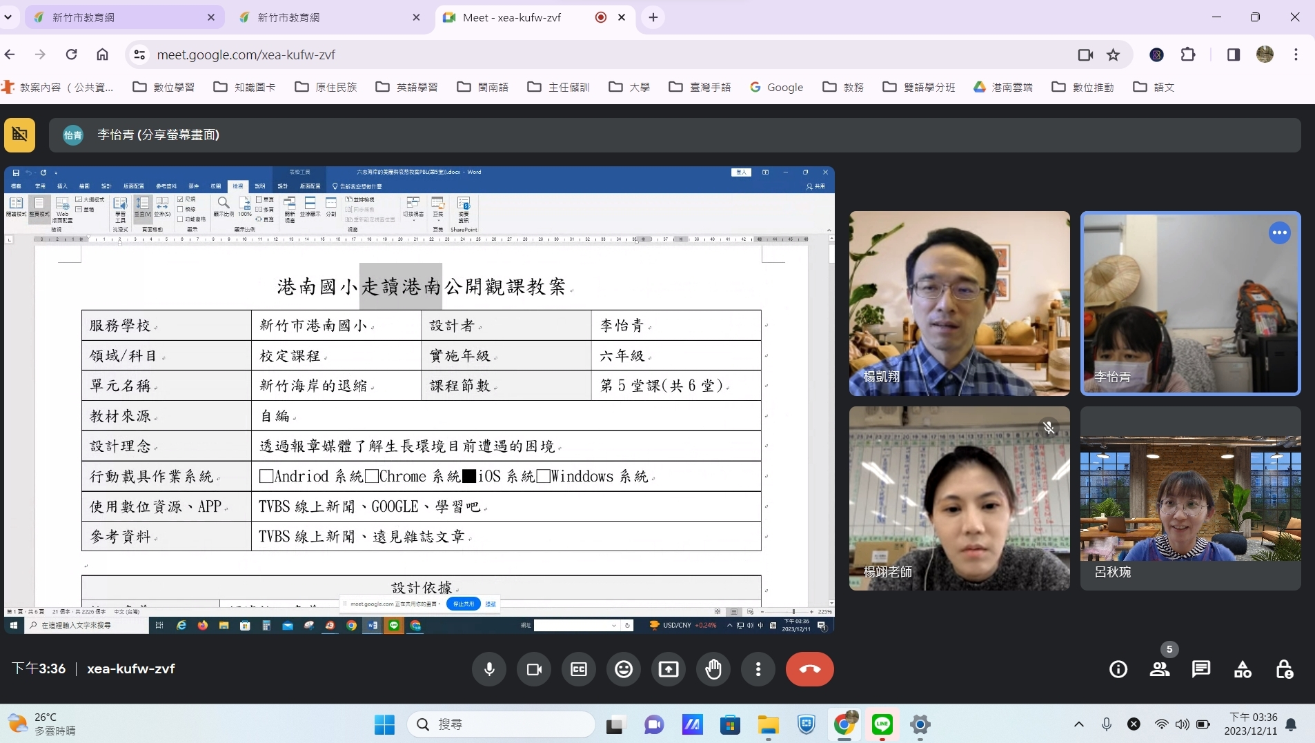 今日楊凱翔教授入校輔導線上會議主要針對走讀港南課程,怡青老師設計的教案進行討論,請教授給予建議。教授表示,提問單的設計若...